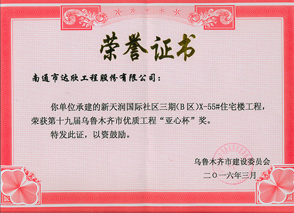 另訊,由我工程公司承建的新天潤國際社區(qū)三期(B區(qū))X-55#住宅樓工程,榮獲第十九屆烏魯木齊市優(yōu)質(zhì)工程“亞心杯”獎。