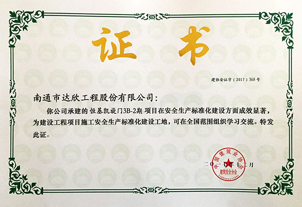 近幾年,我公司獲得全國(guó)AAA級(jí)安全文明標(biāo)準(zhǔn)化工地25項(xiàng),創(chuàng)建面涉及上海、江蘇、河北、黑龍江、湖南、新疆等市場(chǎng),榮譽(yù)的取得為進(jìn)一步提升“達(dá)欣”在全國(guó)各個(gè)市場(chǎng)的影響力,促進(jìn)企業(yè)健康發(fā)展奠定堅(jiān)實(shí)的品牌基礎(chǔ)。