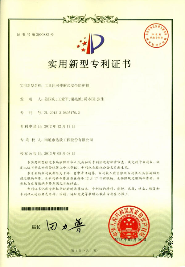 第六工程公司申報(bào)的《組裝式臨邊洞口防護(hù)欄》、《工具化可伸縮式安全防護(hù)棚》專利成果,日前,獲得國(guó)家實(shí)用新型專利證書。