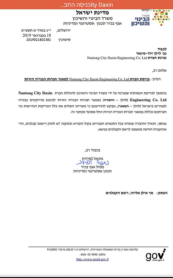 近年來,達欣集團積極響應國家“走出去”和“一帶一路”戰(zhàn)略,大力發(fā)展國際工程承包業(yè)務(wù),此次中標以色列承包商資格,將為集團進一步拓展海外市場提供新的契機。