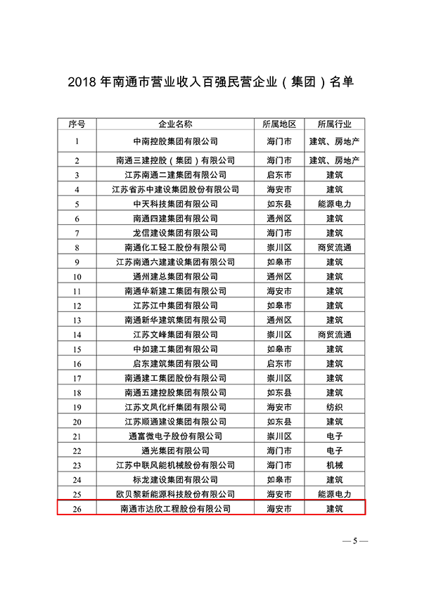 4月23日,南通市工業(yè)和信息化局發(fā)布關(guān)于2018年南通市營(yíng)業(yè)收入百?gòu)?qiáng)民營(yíng)企業(yè)(集團(tuán))情況的通報(bào)。南通市達(dá)欣工程股份有限公司以出色的業(yè)績(jī)榮登百?gòu)?qiáng)企業(yè)榜單,列26位,排名海安第5位(海安共有26家入圍)。