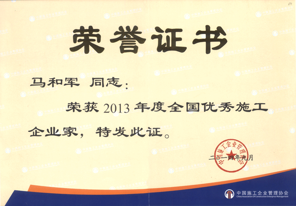 公司董事長馬和軍榮獲全國優(yōu)秀施工企業(yè)家