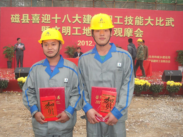 本次職工技能比武共有12家單位參加,通過激烈角觸,第四工程公司寶盛世紀(jì)B區(qū)二期項(xiàng)目部選送的鋼筋組一舉奪得小組第一名、焊接組奪得小組第二名,項(xiàng)目部同時(shí)被授予2012年磁縣建筑職工技能比武特別貢獻(xiàn)單位。