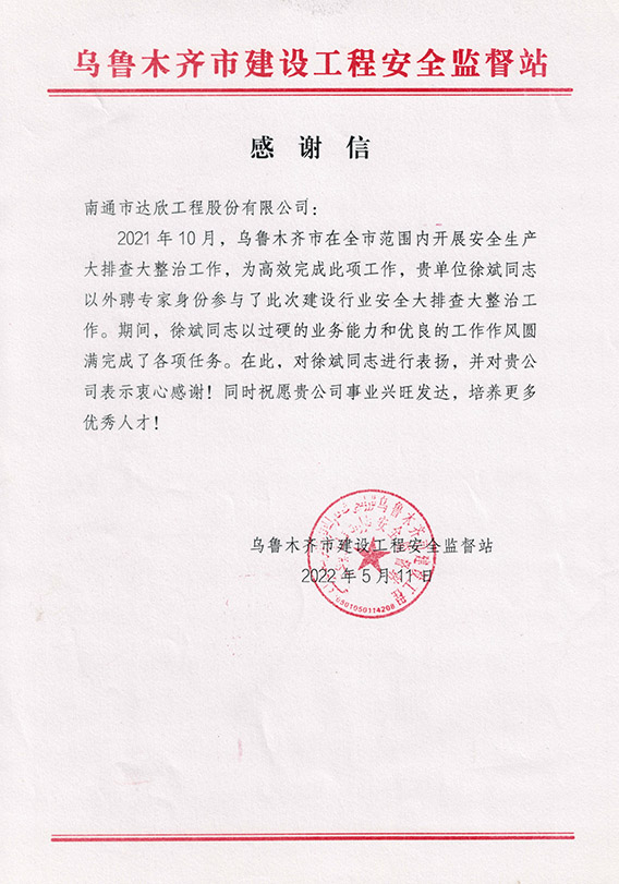 6月8日,集團(tuán)收到一封來(lái)自烏魯木齊市建設(shè)工程安全監(jiān)督站的感謝信,詳細(xì)內(nèi)容如下:
