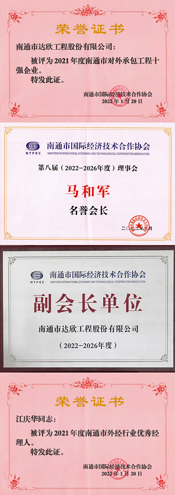 會(huì)上,達(dá)欣集團(tuán)被評(píng)為2021年度南通市對(duì)外承包工程十強(qiáng)企業(yè),董事長(zhǎng)馬和軍當(dāng)選第八屆(2022-2026年度)理事會(huì)名譽(yù)會(huì)長(zhǎng),企業(yè)當(dāng)選為副會(huì)長(zhǎng)單位,柬埔寨分公司江慶華被評(píng)為南通市外經(jīng)行業(yè)優(yōu)秀經(jīng)理人。