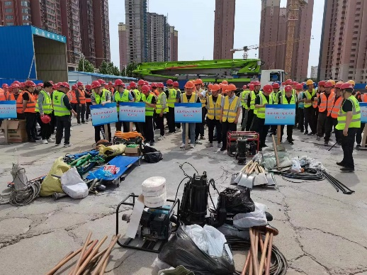 第三工程公司接到通知后,以副經(jīng)理吉祥為組長的應(yīng)急救援小組及時出動,攜帶水泵、發(fā)電機、鐵鍬、頭燈、沙袋、雨靴等防汛物資,參加演練。