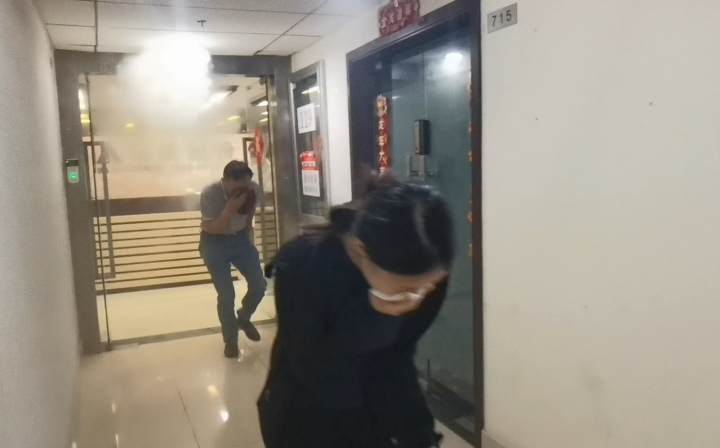現(xiàn)場從發(fā)現(xiàn)著火點、報警、疏散人員等情景開展模擬演練。隨著火警警報的響起,在場人員立即按照預先制定的疏散方案行動。大家迅速采取“彎腰低頭、捂鼻貼墻”的逃生姿勢,在疏散過程中,大家保持冷靜,有序地沿著疏散通道向室外撤離。