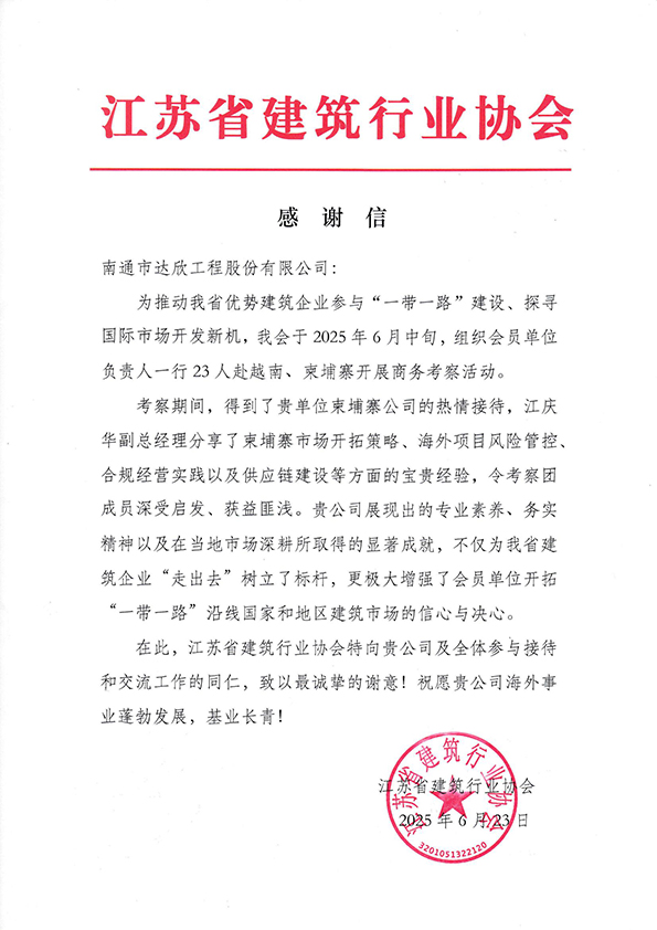 6月23日,集團(tuán)收到來自江蘇省建筑行業(yè)協(xié)會的感謝信。信中對集團(tuán)柬埔寨公司在省協(xié)會組織會員單位赴柬埔寨商務(wù)考察期間,以專業(yè)實力與豐富的實踐為考察團(tuán)提供有益的幫助,特此專函致謝。