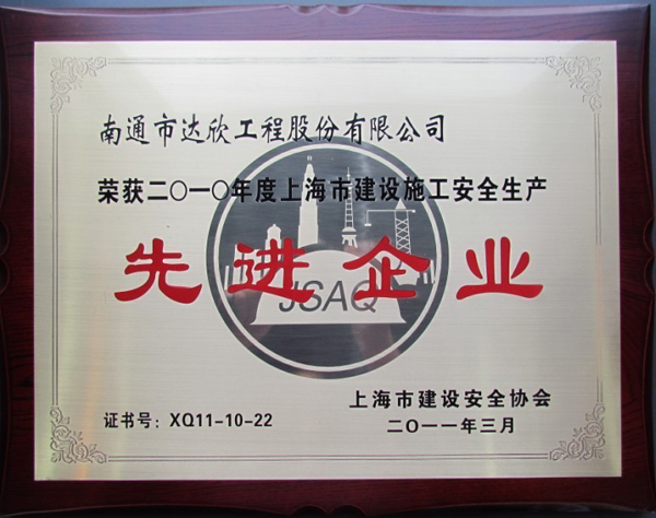 日前南通市達(dá)欣工程股份有限公司被上海市建筑安全協(xié)會(huì)評(píng)為“二0一0年度上海市建設(shè)施工安全生產(chǎn)先進(jìn)企業(yè)”。這是第一工程公司連續(xù)四年獲此殊榮。