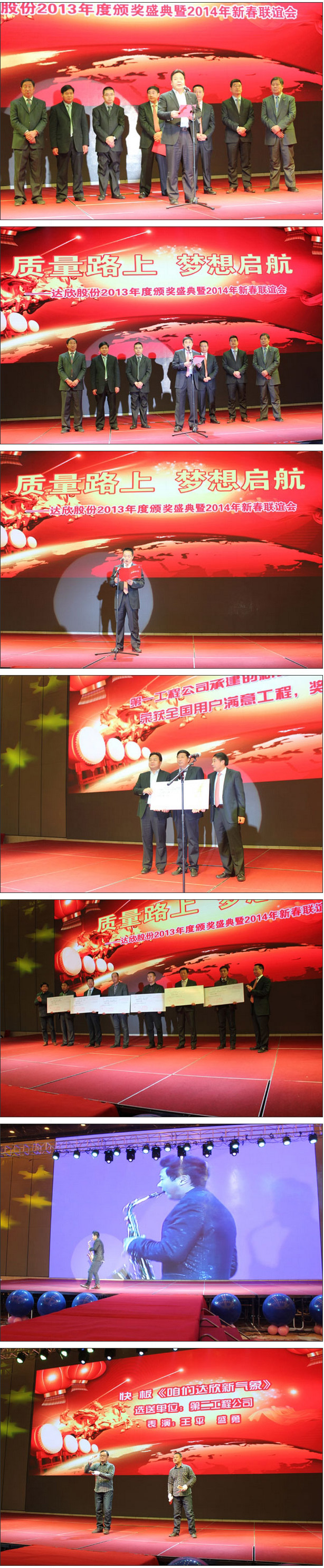 頒獎活動在澎湃的“達欣2013”影片聲中激情開場,公司董事長馬和軍進行了致辭答謝。他回顧了公司一年來所取得的輝煌成績,感謝社會各界及公司全體同志們的努力,并對公司的未來發(fā)展之路描繪了藍圖;接著,縣委書記陸衛(wèi)東發(fā)表重要講話,他指出,建筑業(yè)是我縣的傳統(tǒng)產(chǎn)業(yè),也是一個富民強勢產(chǎn)業(yè),還是我縣財政收入的重要來源之一,作為縣內(nèi)的骨干企業(yè),達欣公司步入了公司歷史以來發(fā)展最快、榮譽最高、分配最多、貢獻最大的時期,他希望公司要加快發(fā)展,高起點定位,突出重點,好中求快,實現(xiàn)達欣新飛躍。