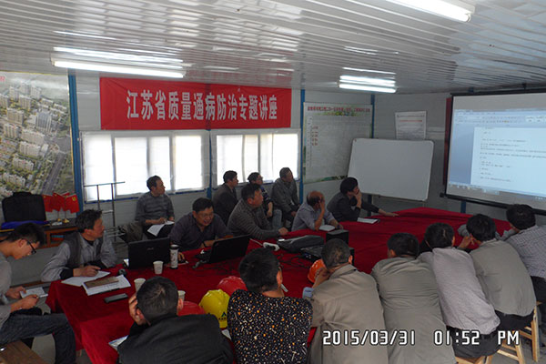 第九工程公司技術(shù)負責人楊本榮進行了主講。培訓重點圍繞《江蘇省質(zhì)量通病防治》手冊,圖文并茂的講解,使大家對工程中存在的質(zhì)量通病的防治有了進一步的了解和認識,同時針對祥河灣項目檢查存在的質(zhì)量問題,楊本榮同志還進行了耐心細致的原因分析及拿出了解決方案。